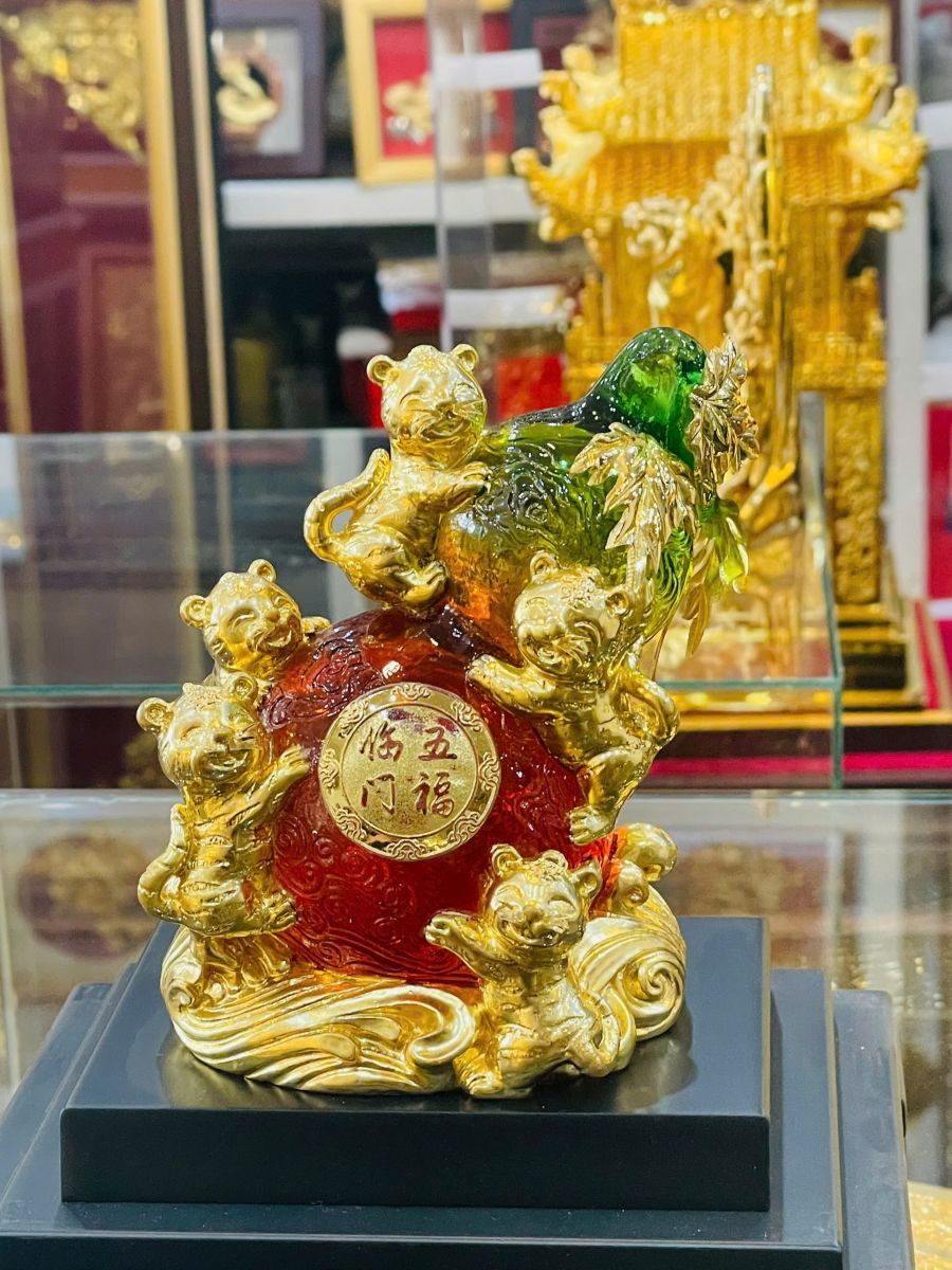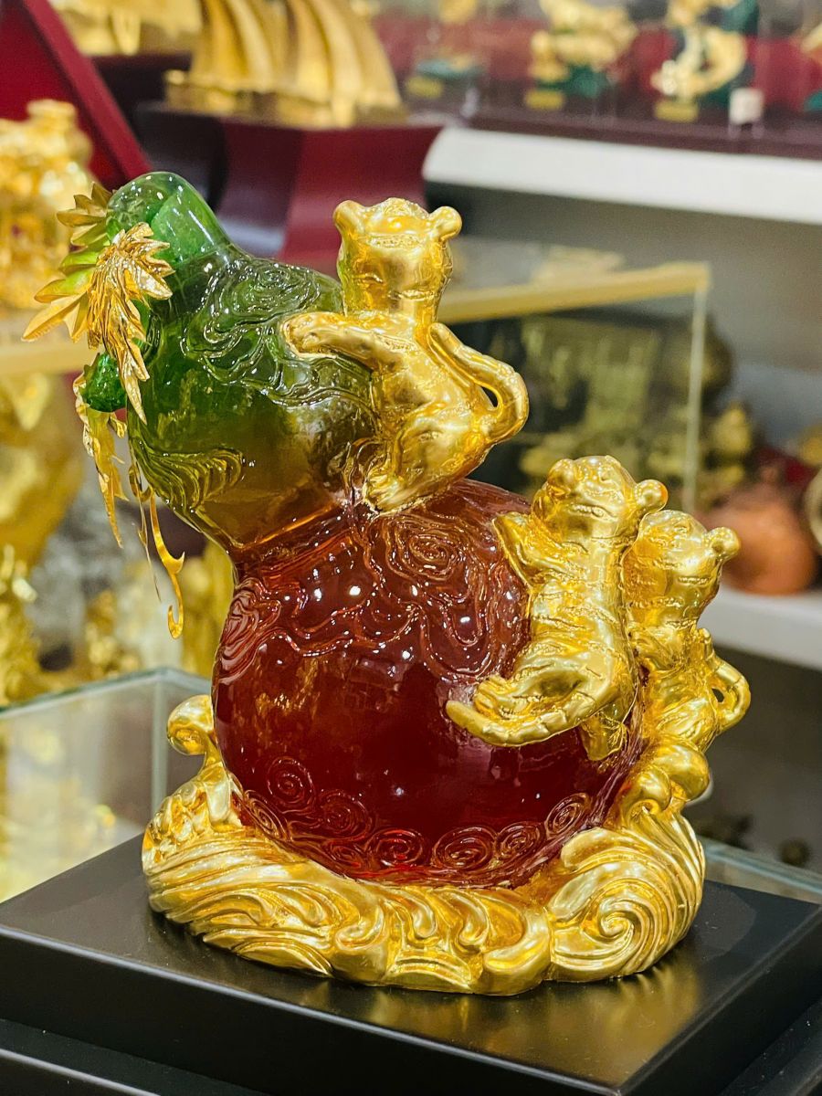 Bức tượng được tạo hình từ chất liệu lưu ly cao cấp kết hợp các chi tiết mạ vàng 24K sang trọng, tái hiện hình ảnh đàn hổ quây quần bên hồ lô đỏ rực – biểu tượng của phúc khí, tài lộc và sự bảo hộ. Tổng thể tác phẩm mang đến vẻ đẹp sang trọng, quyền uy nhưng vẫn hài hòa, tinh tế, phù hợp để trưng bày trong nhiều không gian cao cấp.