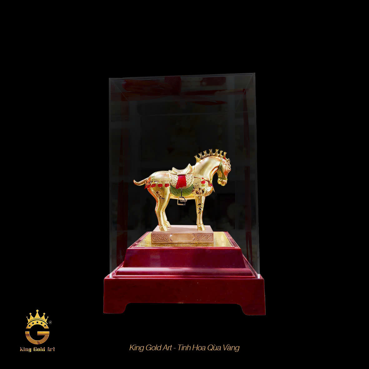 Đặc biệt, bờm ngựa được thiết kế như một chiếc vương miện vàng – chi tiết mang ý nghĩa biểu trưng cho quyền lực và vị thế. Lớp vàng 24K phủ bên ngoài không chỉ giúp bức tượng trở nên lấp lánh, sang trọng mà còn góp phần bảo vệ bề mặt sản phẩm, giữ được vẻ đẹp bền lâu theo thời gian.