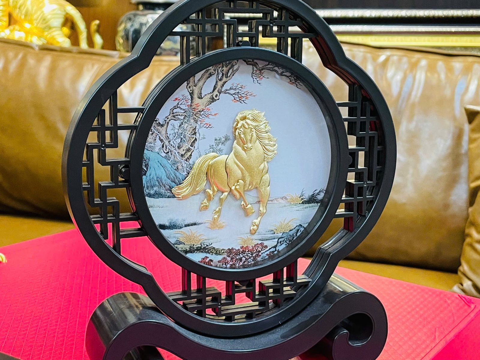 Giá trị của một món quà không chỉ nằm ở ý nghĩa mà còn thể hiện qua chất liệu chế tác. Bức tranh Nhất Mã Phi Thiên được tạo nên từ sự kết hợp hoàn hảo giữa kỹ thuật thủ công truyền thống và công nghệ mạ vàng hiện đại. Điểm nhấn đắt giá nhất chính là lớp vàng 24k phủ bên ngoài linh vật.