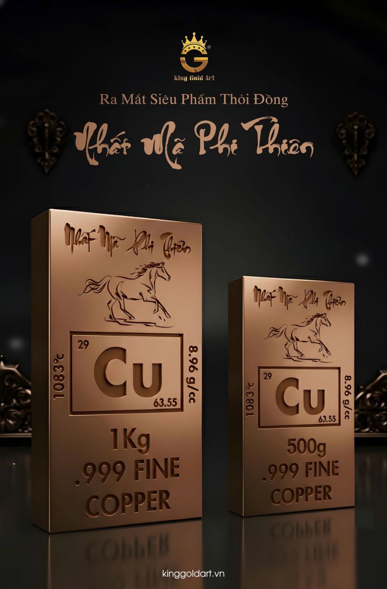 Đồng từ lâu đã được xem là kim loại gắn liền với sự bền bỉ, ổn định và trường tồn. Trong mỹ thuật truyền thống phương Đông, những vật phẩm chế tác từ đồng đỏ nguyên chất không chỉ mang giá trị thẩm mỹ mà còn hàm chứa ý nghĩa phong thủy sâu sắc. Dòng đồng thỏi Nhất Mã Phi Thiên do King Gold Art chế tác là sự kết hợp hài hòa giữa chất liệu cao cấp, kỹ thuật hiện đại và biểu tượng cát tường, tạo nên một sản phẩm vừa sang trọng, vừa mang tính biểu trưng mạnh mẽ.